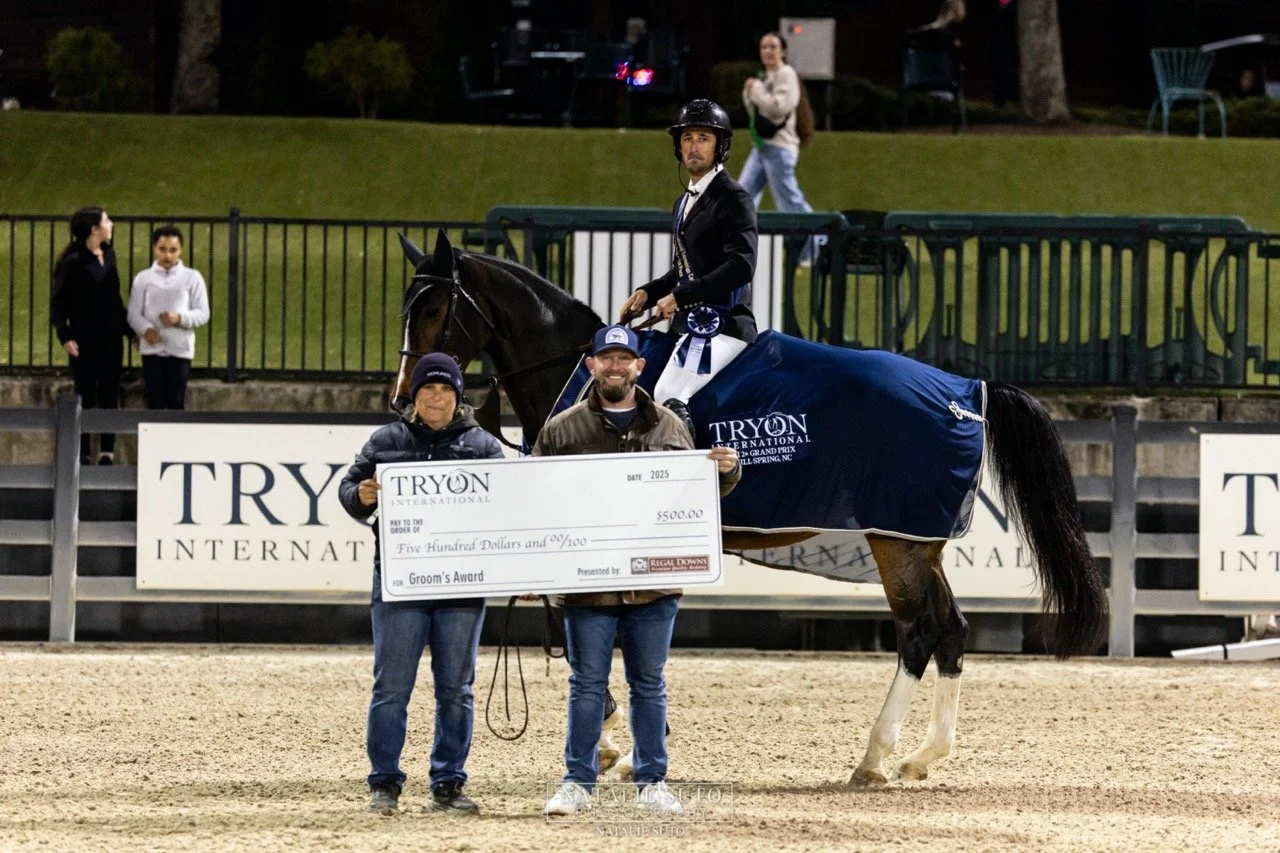 Jenni Giannini was awarded the Groom’s Award presented by Carolina Shavings for her care and dedication to Balounita, alongside Tryon International’s Drew Page.