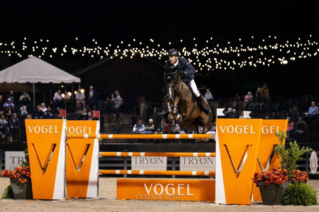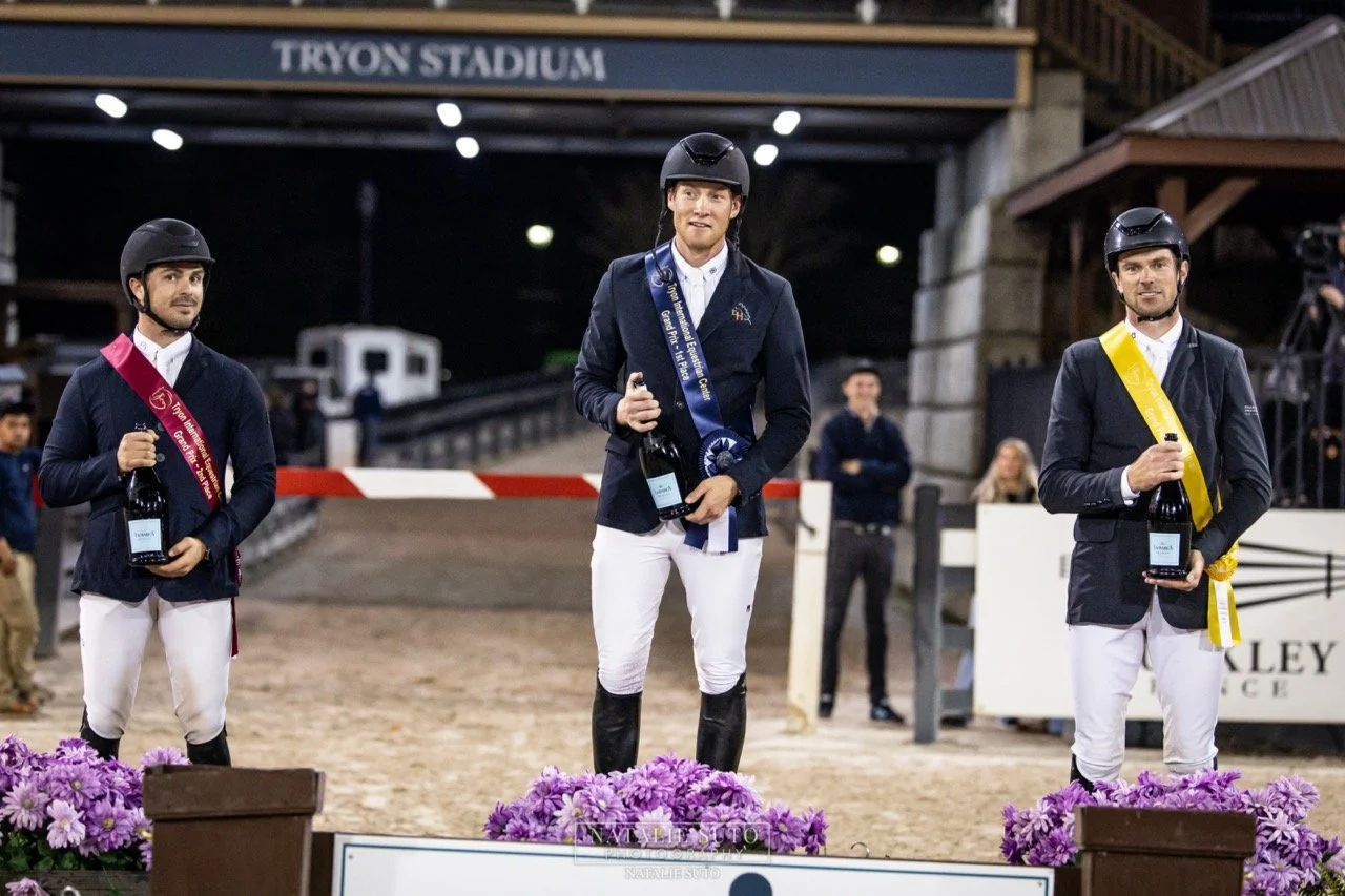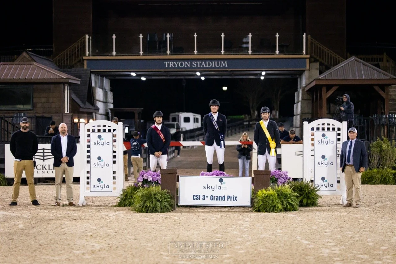 October 11, 2025 – Mill Spring, NC – Capping off an action-packed evening of Show Jumping $120,000 Skyla Credit Union Grand Prix CSI 3*, Rupert Carl Winkelmann (GER) emerged as the top competitor in a field of 40 teams. Paired with his own Imodo (Bessemeind’s Quasimodo Z x Broere VDL Corland), Winkelmann produced one of only two double clear rounds of the night, finishing the short track in 42.70 seconds. Owner and rider of Flagship De Hus (Windows VH Costersveld x Fergar Mail), Alejandro Leonardo Winkler (MEX) slotted into second place, recording 44.11 seconds in the jump off with the 2015 Selle Francais mare. Keeping the poles up but incurring two time faults to land in third, David Blake (IRL) piloted Conblue (Conthargos x Chacco-Blue), Pine Hollow Farm’s 2014 Oldenburg gelding, to a 53.06 second jump off.