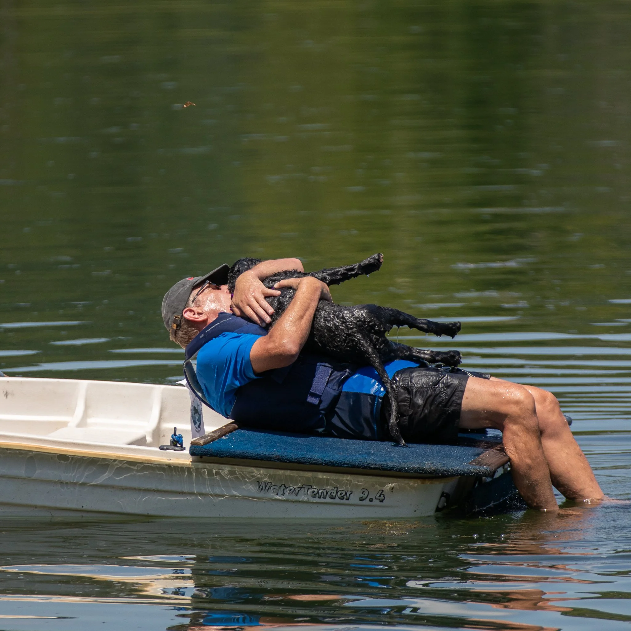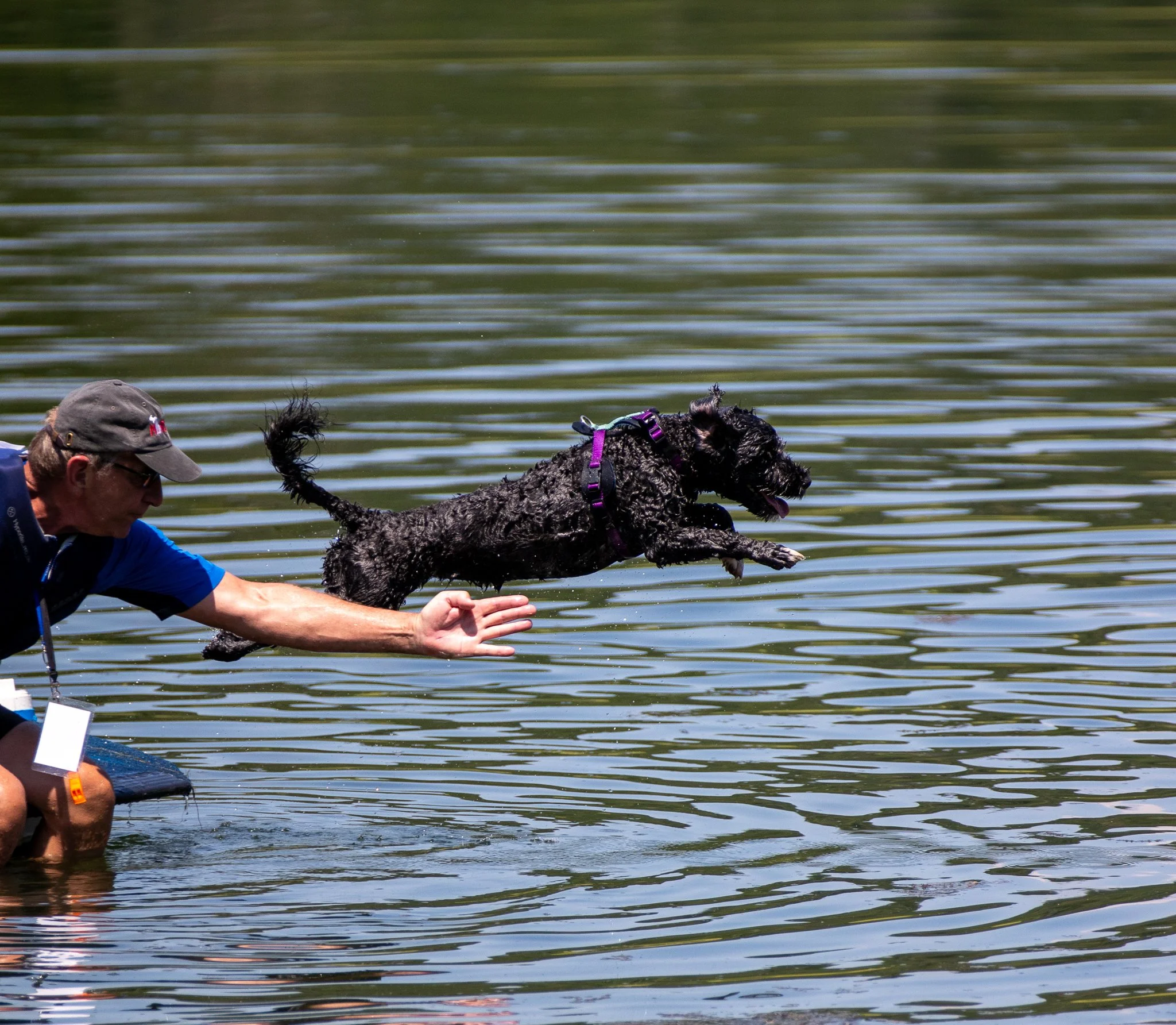 Mill Spring, NC - August 17, 2025 - The Movers and Shakers Portuguese Water Dog Club of the Carolinas took over the White Oak Cross Country course pond at Tryon International for the 2025 Blue Ridge Splash Water Trials. Kent Nelson (Mill Spring, NC), Water Trial Chairman, and his Portuguese Water Dog (PWD) Diamond took to the water with their 2025 title “Master Water Dog 9”. Diamond was the first female and youngest dog to receive this title.
