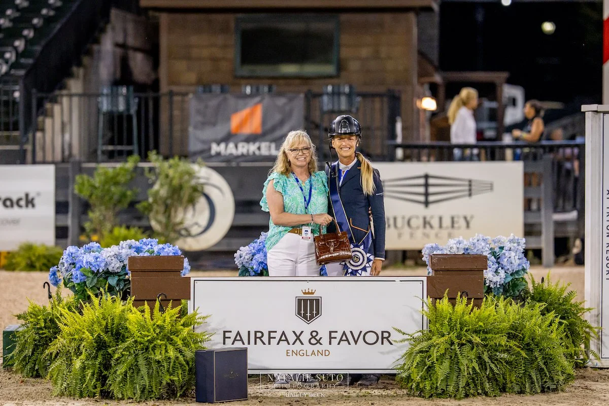 As the highest placing female rider in the $120,000 Cleghorn Golf & Sport Club Grand Prix CSI 3*, Kristen VanderVeen received the Leading Lady Award presented by Fairfax & Favor alongside Paula Cudd.