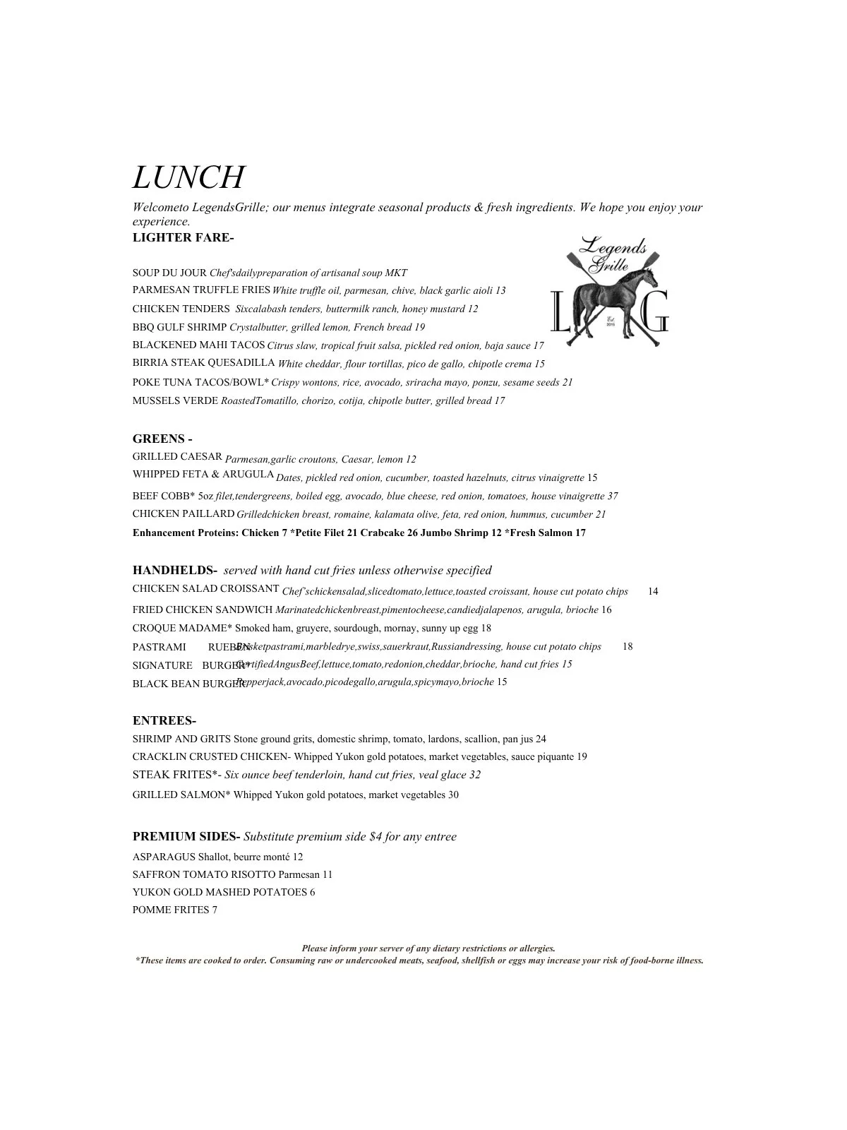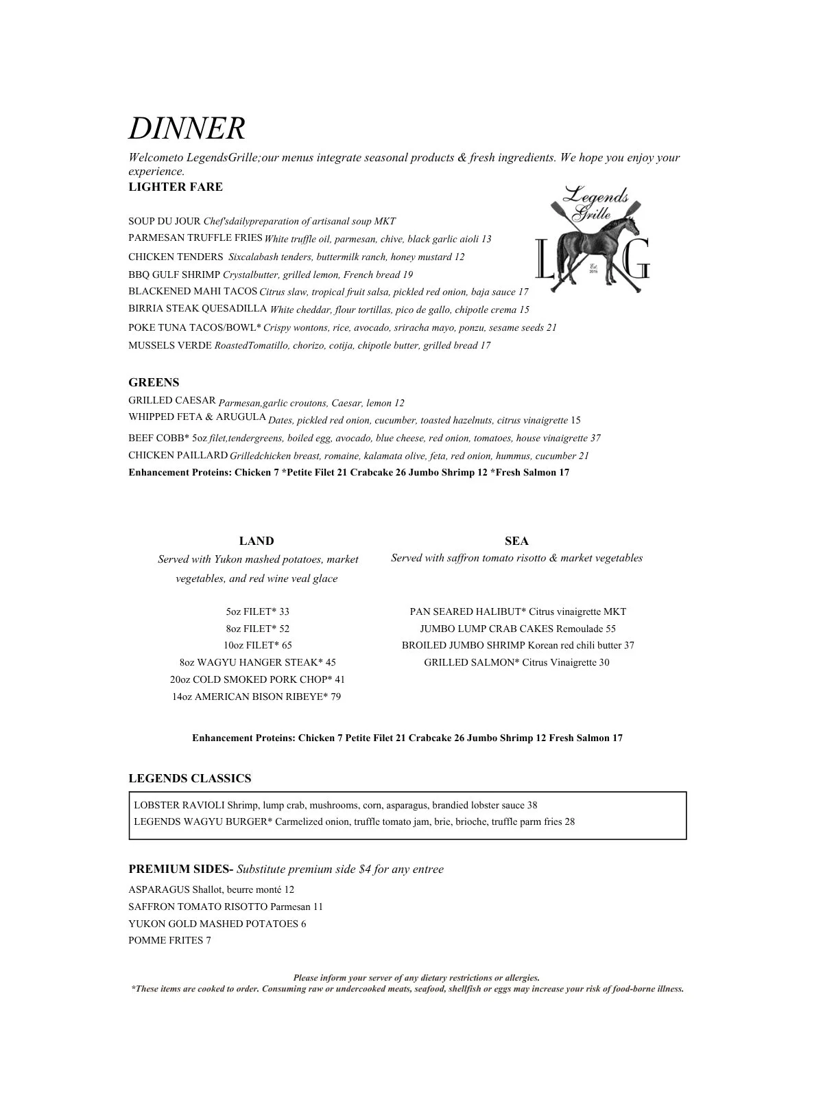 For the most up-to-date hours of operation, please visit Legends Grille’s