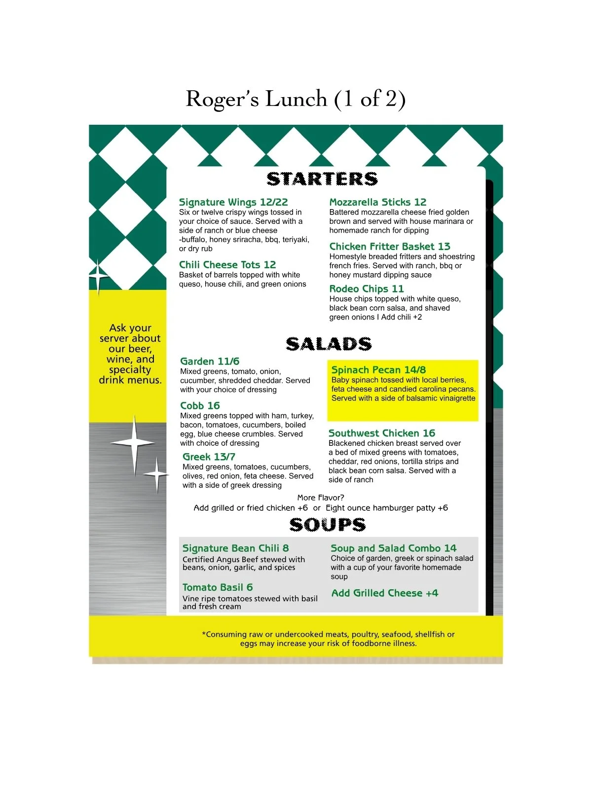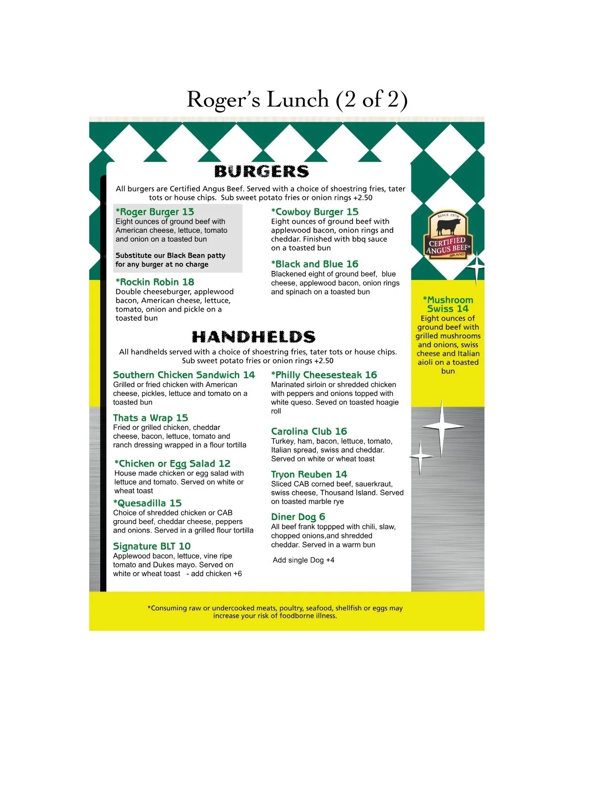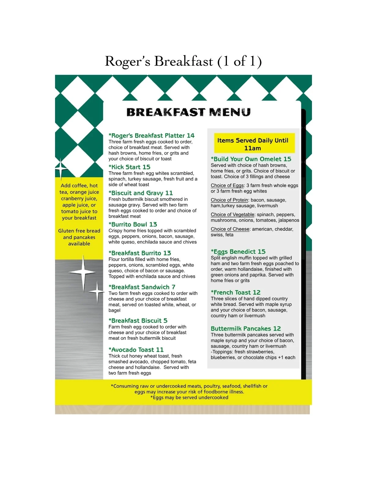 For the most up-to-date hours of operation, please visit Roger’s Diner