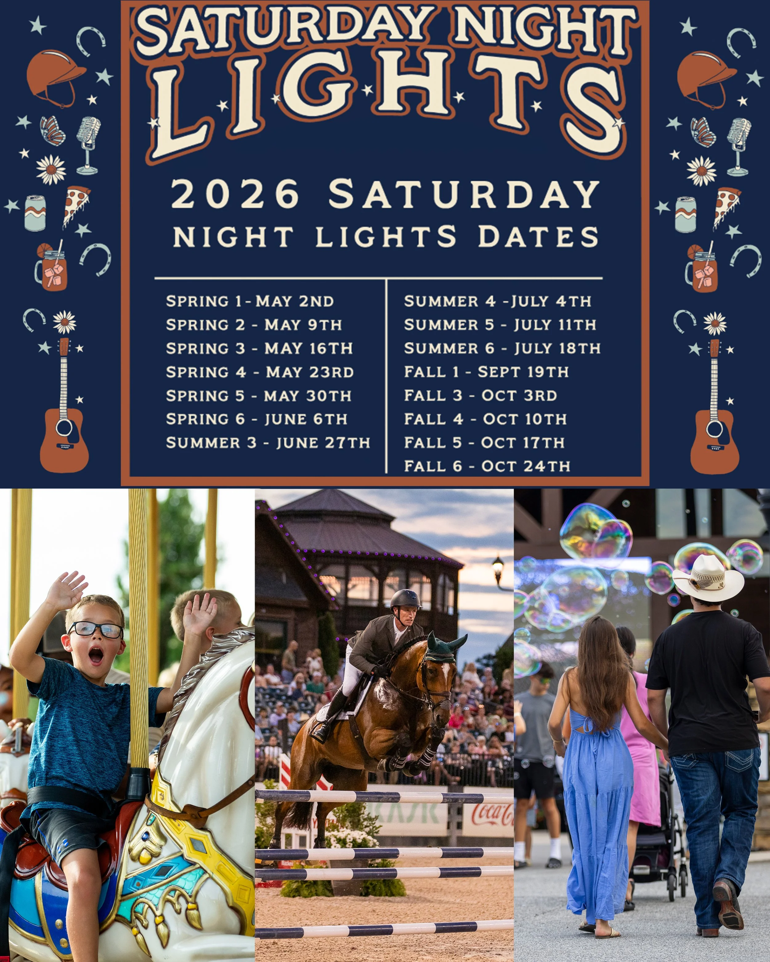 Paid parking for Saturday Night Lights (cash or card both accepted) will begin at 3pm, and all horse show and lodging guests will be provided with passes to provide a seamless experience. Our guests can continue to expect free kids activities (such as face painting, pony rides, carousel rides, etc.), live music and entertainment, free access to all shopping and dining options, and world-class competition at no charge.